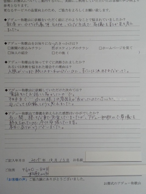 長い間、様々な事で思案していましたが、アデュー和歌山で葬儀を終えられたので今は安堵しています。