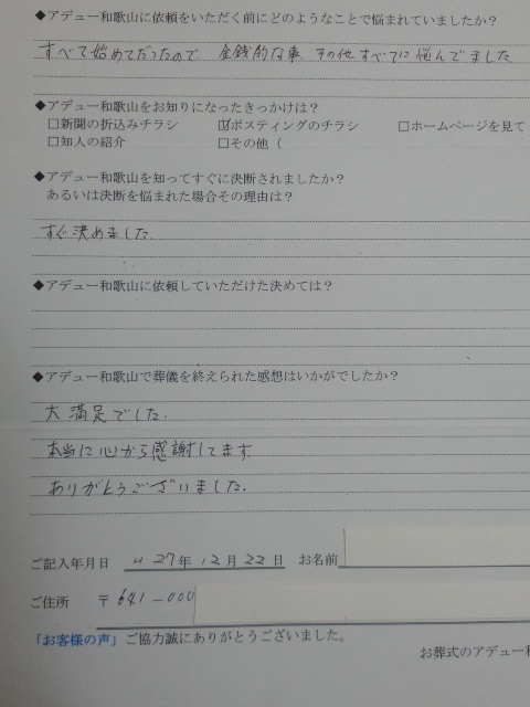 ◆アデュー和歌山で葬儀を終えられた感想はいかがでしたか?