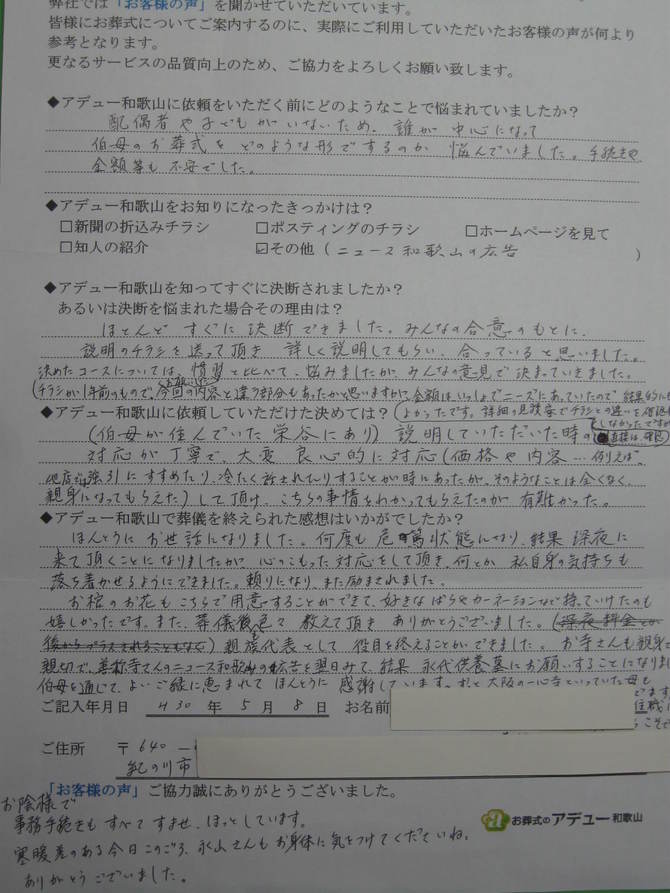 ◆アデュー和歌山で葬儀を終えられた感想はいかがでしたか?