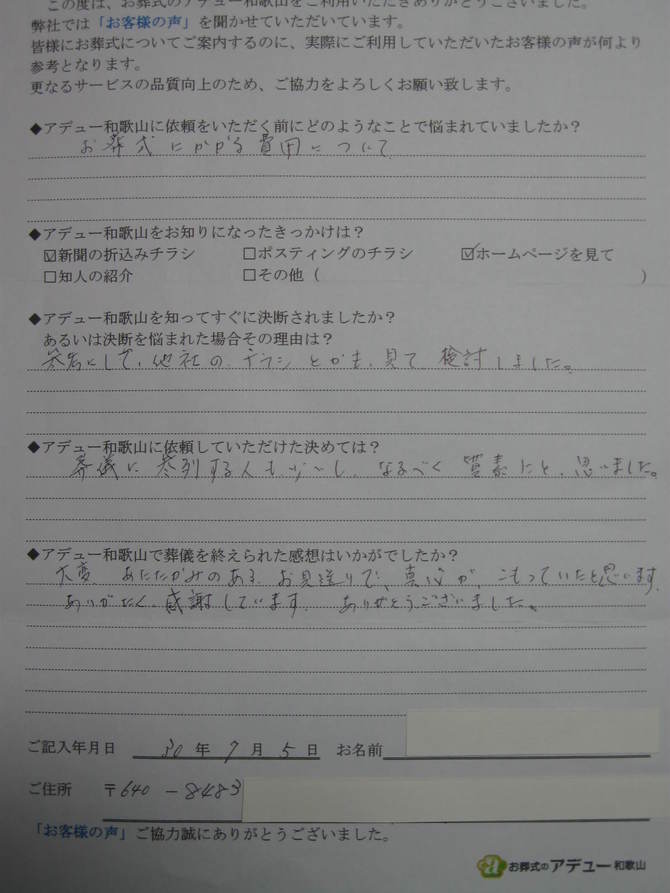 ◆アデュー和歌山で葬儀を終えられた感想はいかがでしたか?