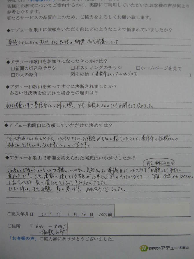 これちょっとどうなの?というマイナス要素の一切ない、気持ちのよい葬儀をしていただけてアデュー和歌山さんにお願いして本当に良かったです。ただ遺影に使えそうな写真が10年以上前のものしかなくて・・・「写真と全然かわりませんね」と言っていただき、気を遣わせてしまってすみませんでした。