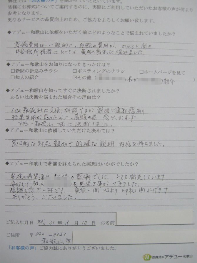 他の葬儀社に見積り相談するが説明に違和感有り結果費用が思った以上、高額の為捻出できずアデュー和歌山様に決断しました。