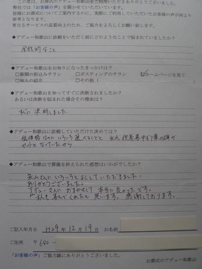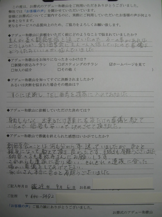 ◆アデュー和歌山で葬儀を終えられた感想はいかがでしたか?